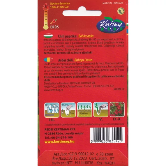 Chili paprika vetőmag bohócsapka. A bohócsapka chili paprika – nemzetközi nevén Bishop’s Crown (Capsicum baccatum) – az egyik legismertebb és legkülönlegesebb megjelenésű chili fajta. Már első pillantásra felismerhető jellegzetes, kalapra vagy harangra emlékeztető termésformájáról, amely peremes „szoknyával” zárul. Erőteljes, bokros növekedésű, jól elágazó növény, amely kedvező körülmények között 80–120 cm magasra is megnő, és hosszú időn keresztül bőségesen terem.