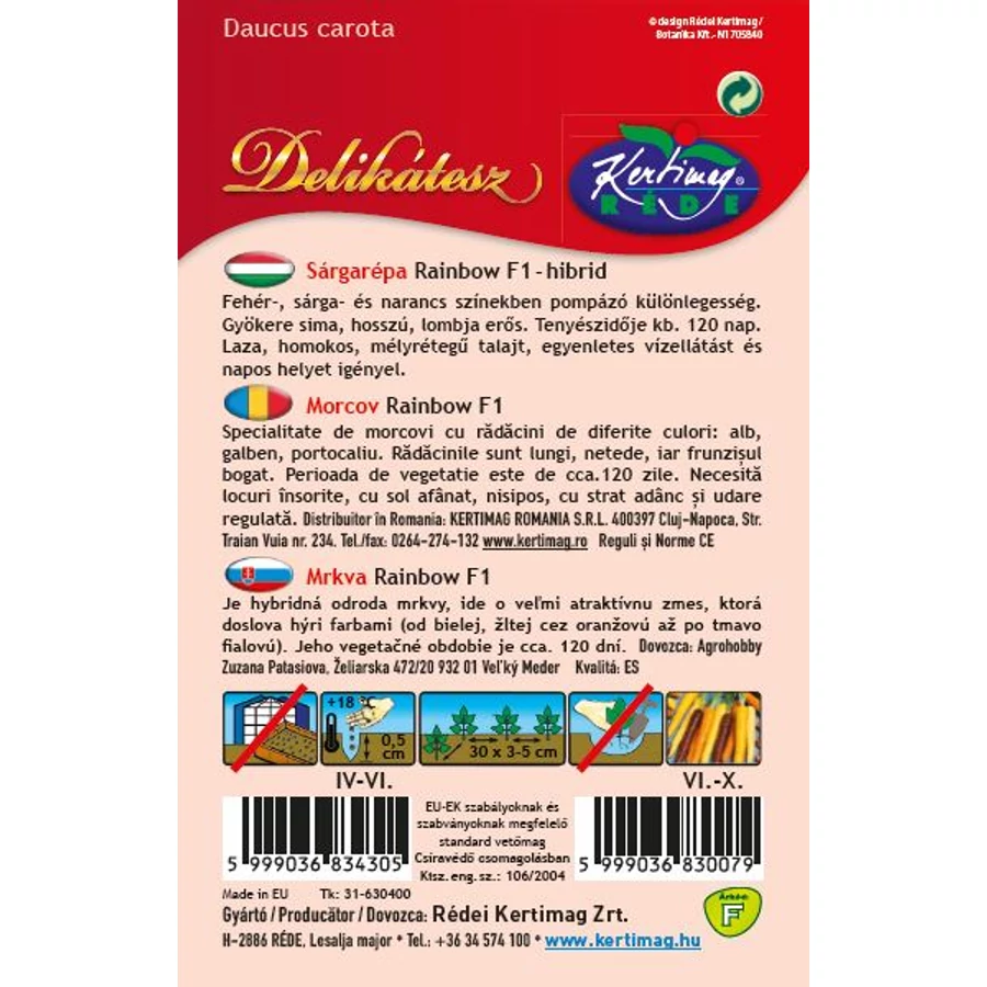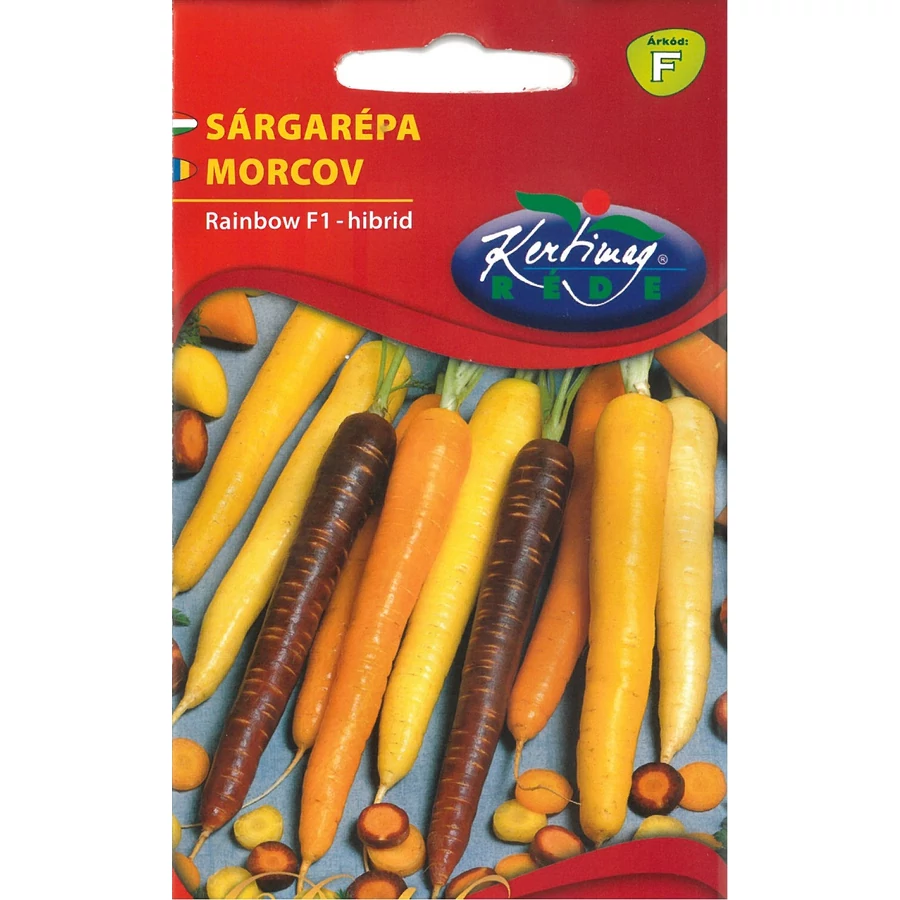 Sárgarépa vetőmag, Rainbow F1-hibrid. A Rainbow F1 egy különleges, hibrid sárgarépa-fajta: gyökerei több színben – fehérben, sárgában és narancssárgában – nevelkednek, így minden egyes kihúzott répa egy meglepetést jelent a kertben. A gyökerek simák, hosszúak, a lomb erős; tenyészideje kb. 120 nap.