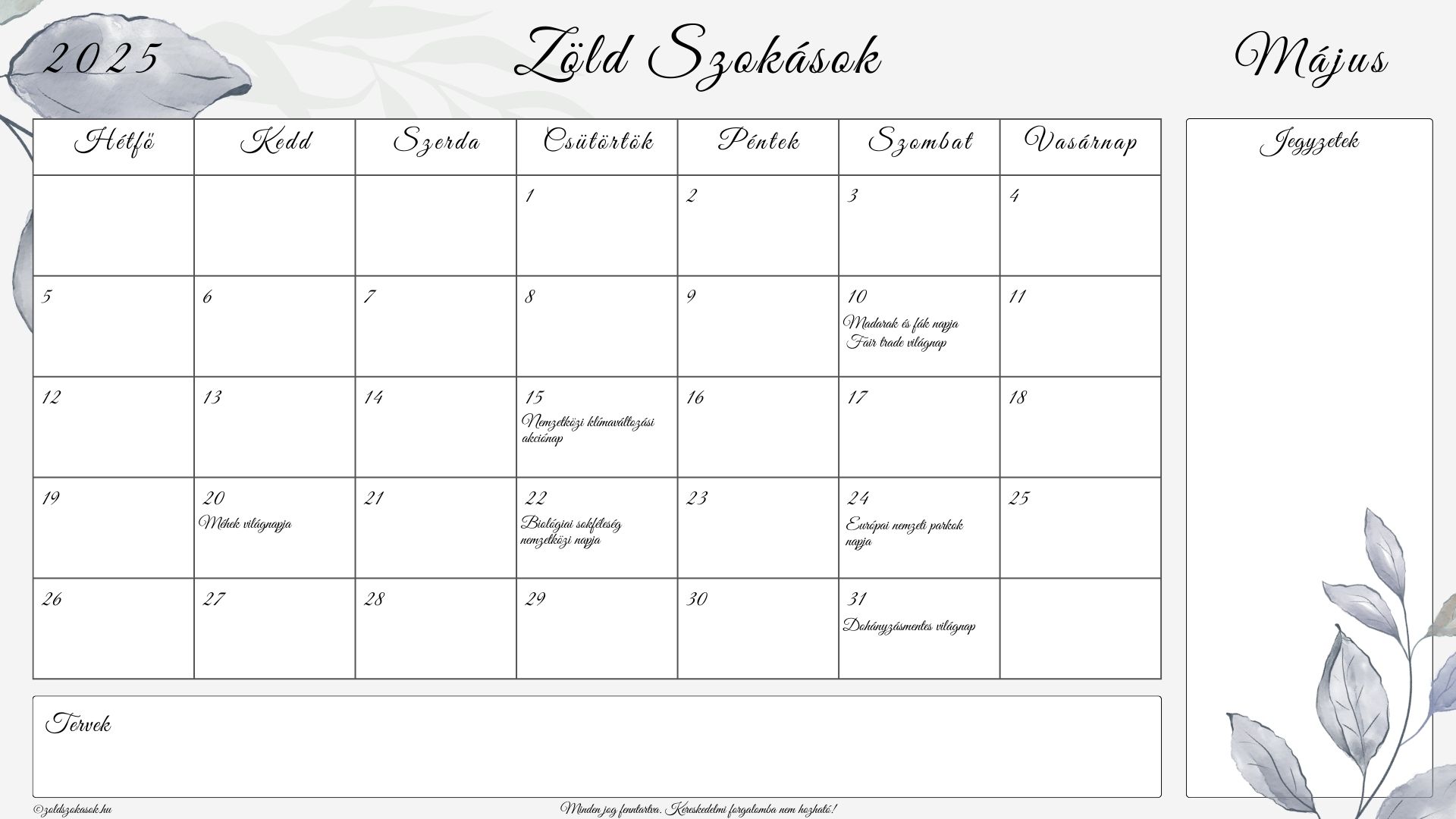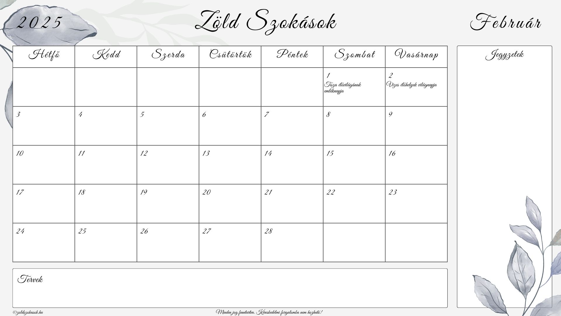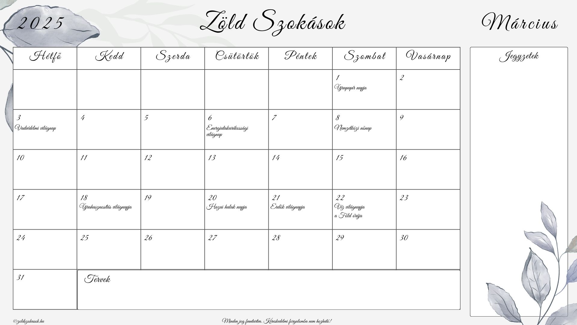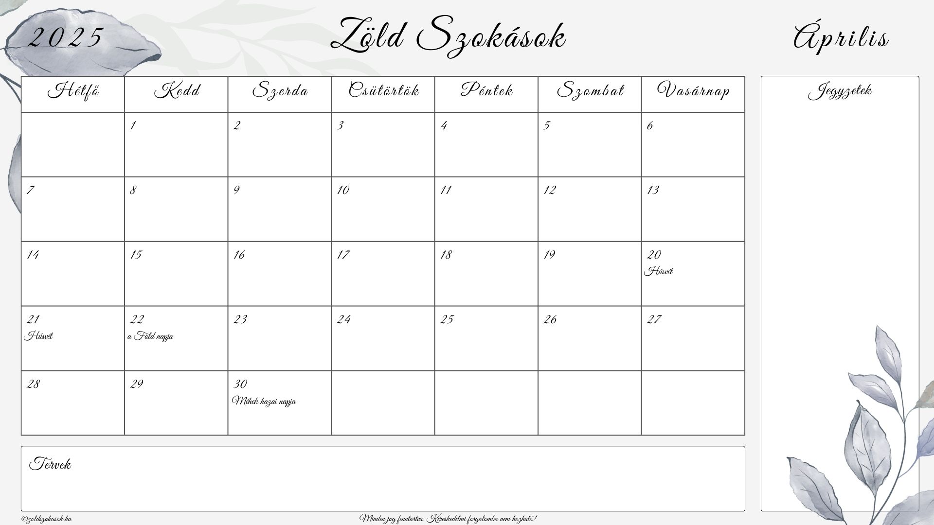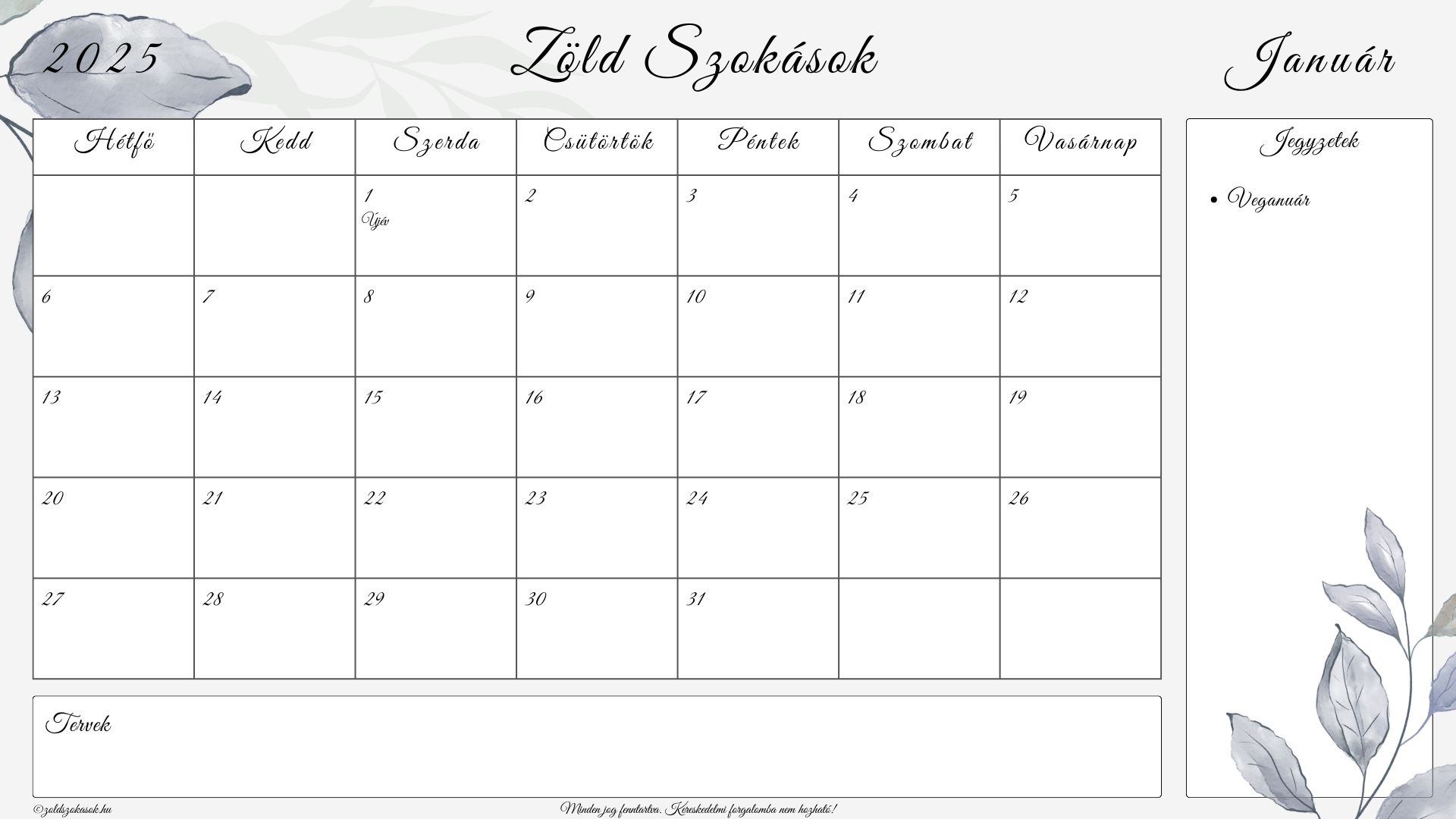 Ingyenesen letölthető Zöld Szokások 2025-ös tervező naptár jpg formátumban, kattints a képekre a letöltéshez: